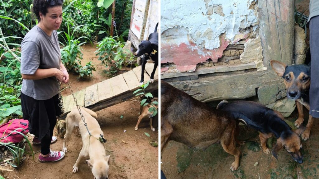 Os cães machos estavam presos por correntes sob a estrutura da casa, que mostrava sinais evidentes de deterioração e risco de desabamento, devido à madeira comprometida em sua construção. A residência também não contava com rede de esgoto nem acesso a saneamento básico.