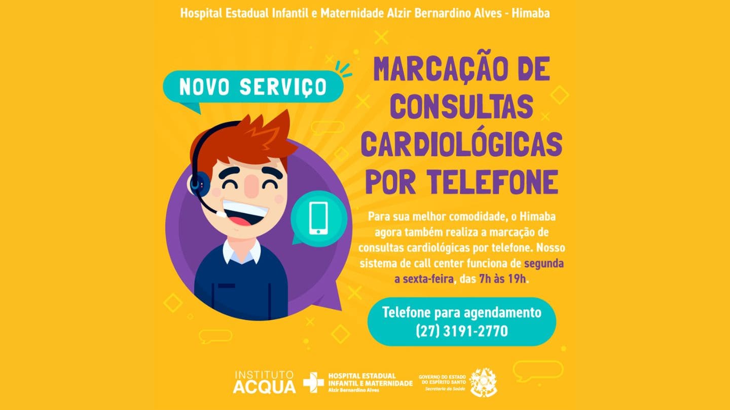 A partir da próxima segunda-feira (03), a marcação de consultas ambulatoriais de Cardiologia no Hospital Estadual Infantil e Maternidade Alzir Bernardino Alves (Himaba), em Vila Velha, será realizada somente por telefone. O número é (27) 3191-2770, mesma linha que, desde o último dia 13, funciona para marcação de outras especialidades.
