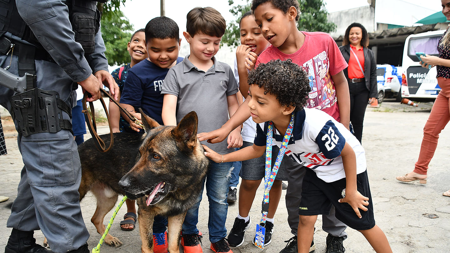 Durante as visitas foram apresentadas o funcionamento do Batalhão, as atividades da seção de trânsito e uma apresentação de abordagem com o uso do cão policial Mike.