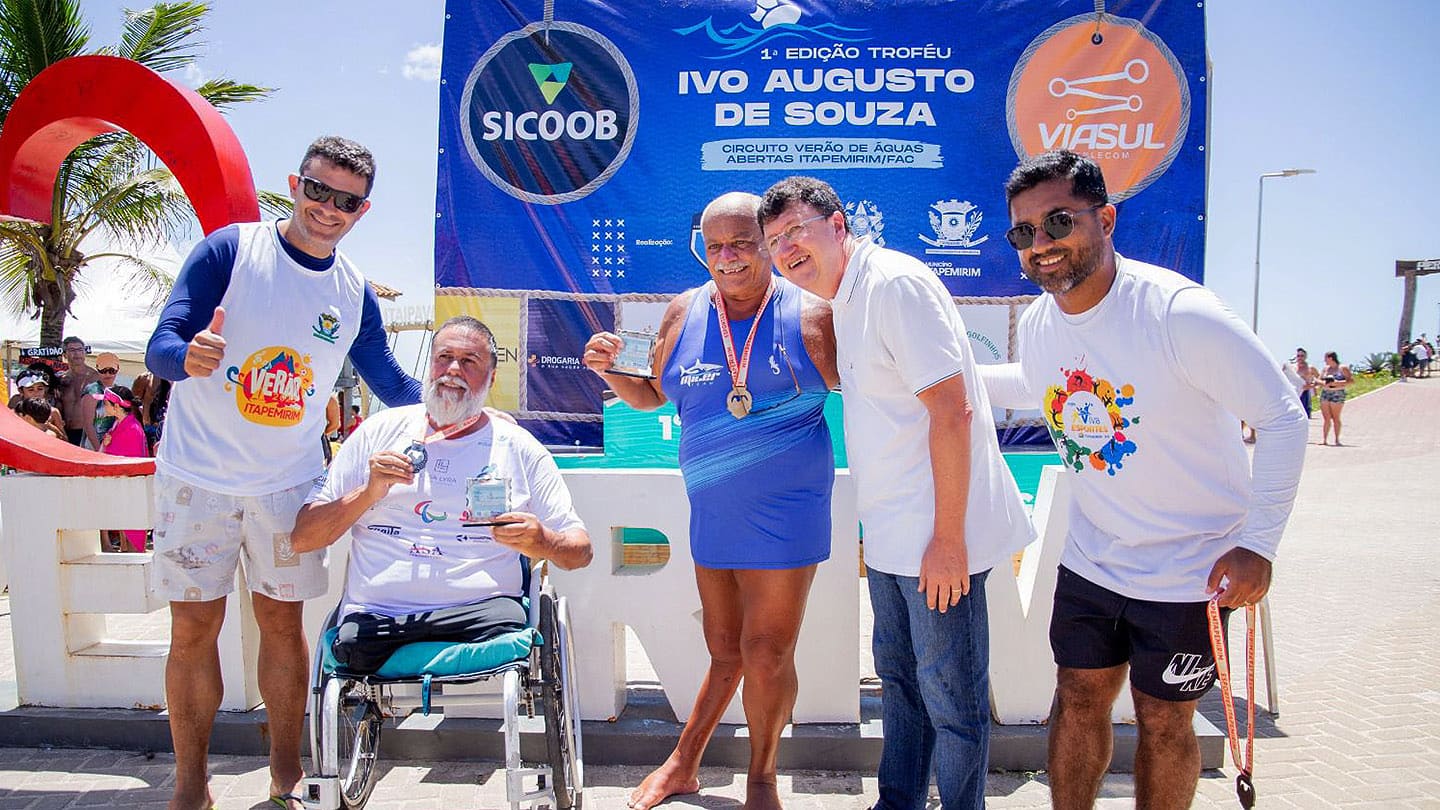 Diversas gerações de nadadores se encontraram para disputar a 1ª edição do “Circuito Verão de Águas Abertas Itapemirim/FAC”, que homenageou o saudoso “Ivo Augusto de Souza” com seu nome no troféu da travessia.