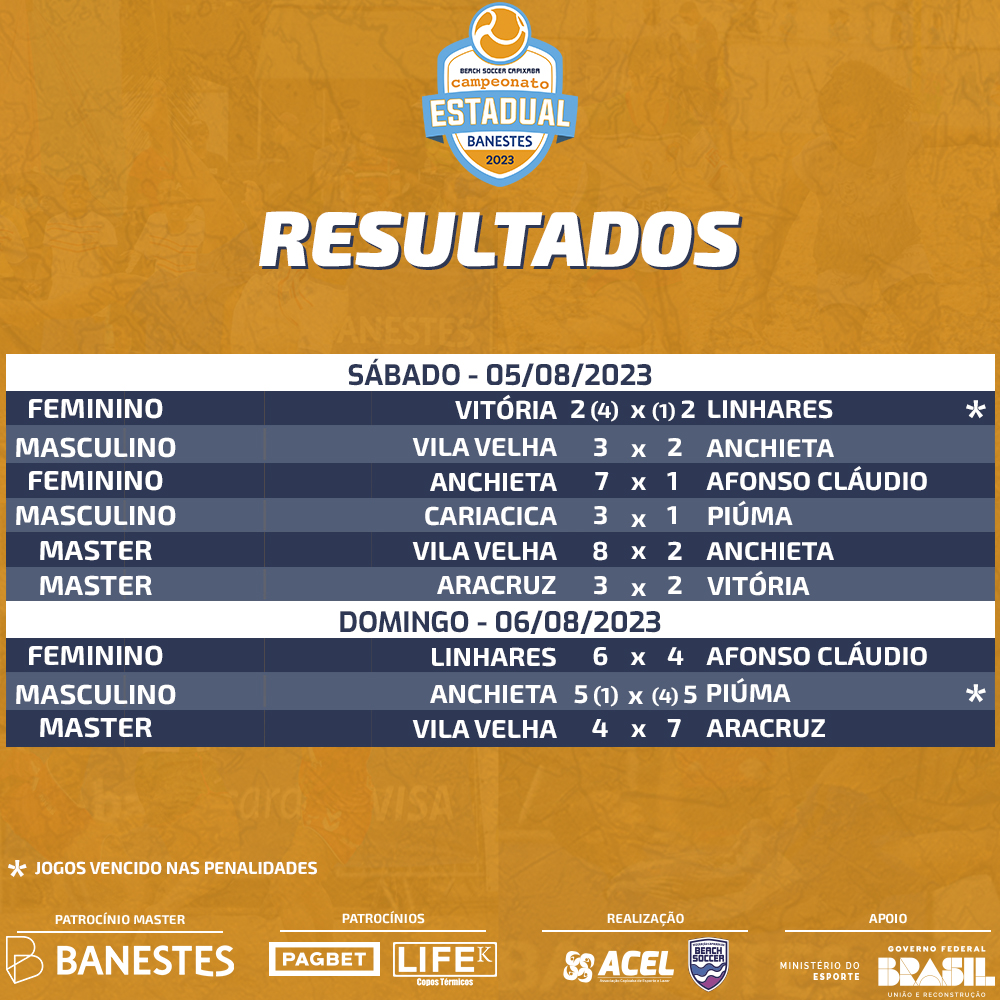 O fim de semana foi de semifinal na mais tradicional competição de Beach Soccer. No masculino, Vila Velha e Cariacica farão a final, e no feminino, Anchieta e Vitória disputam o jogo decisivo. Já na competição para atletas com mais de quarenta anos, Aracruz levou a melhor sobre Vila Velha e foi o campeão na Praia da Costa.