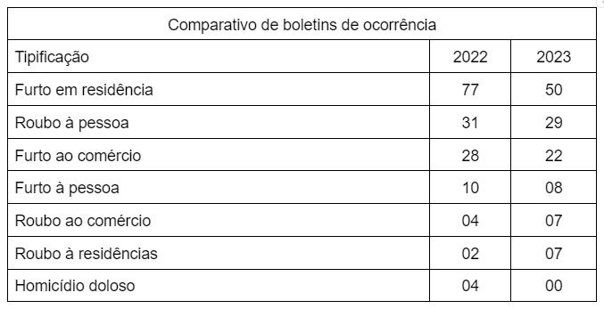 Segundo o comparativo das ocorrências em 2023 em relação a 2022, houve redução em furtos à residências, comércios e à pessoas. Também foram registrados menos casos de roubos à pessoas e zerados os casos de homicídios dolosos (quando há intenção de matar).