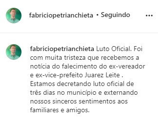 Através de sua rede social, o prefeito de Anchieta, Fabrício Petri, decretou luto oficial de três dias no município.
