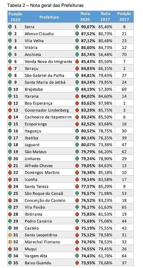 No início de 2017 o município obteve a nota 56,48, ficando na 70ª posição em relação às demais prefeituras do Estado. Já a recente avaliação feita pelo TC constatou uma considerável evolução, saltando para a 5ª posição com a nota 85,74.
