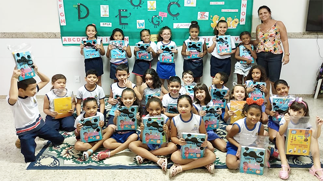 A entrega dos kits foi feita de maneira descontraída, lúdica e divertida, com a contação da história “A revolta das letras”. Momentos que fazem com que as crianças aprendam brincando.