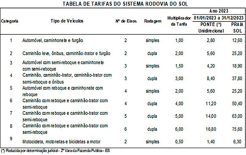 A Agência de Regulação de Serviços Públicos (ARSP) anuncia que no ano de 2023 o valor da tarifa para carros de passeio será de R$ 2,80 na Terceira Ponte e R$ 12,60 na Praça Praia Sol, em Guarapari.