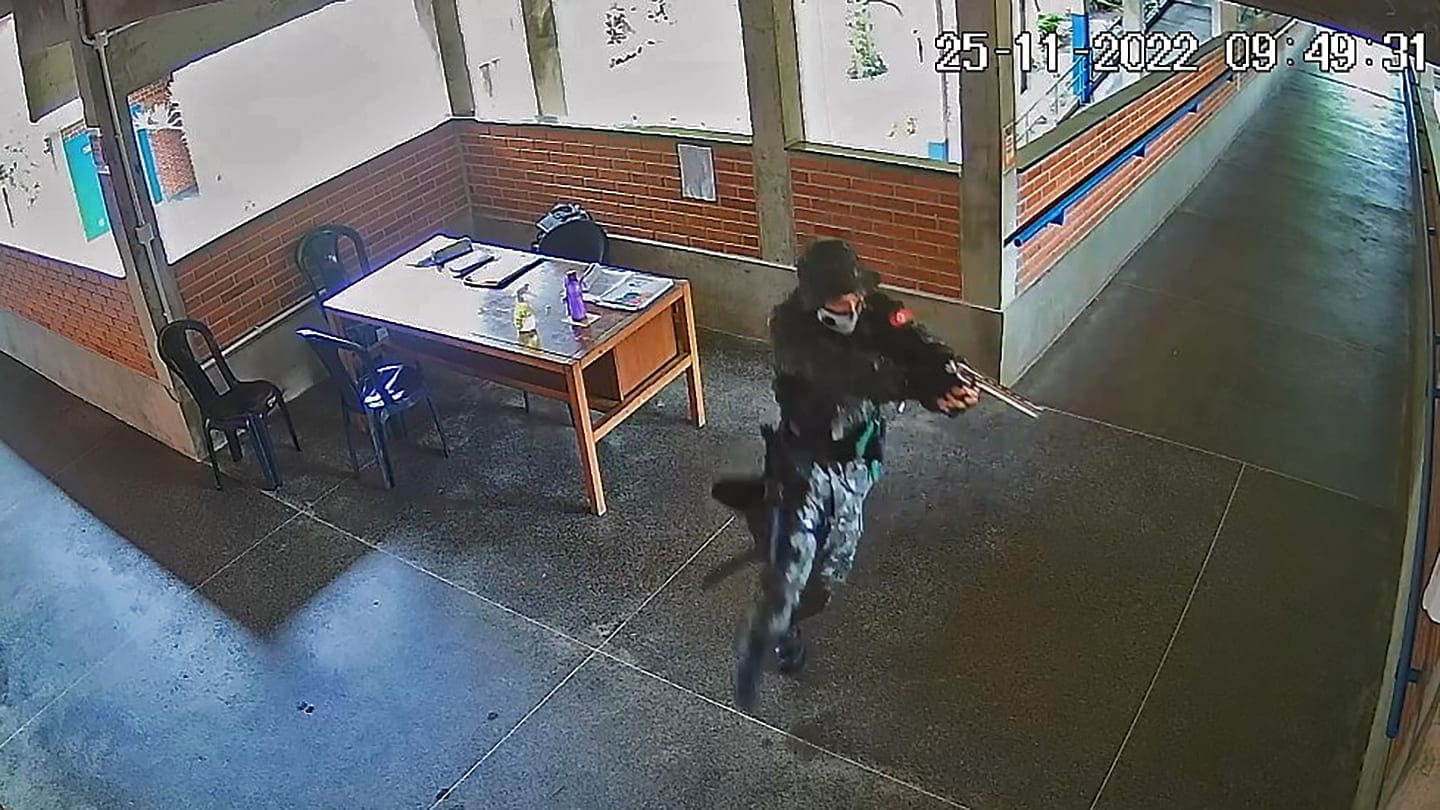 Nas câmeras de segurança de uma das escolas é possível ver o momento em que o atirador entra e sai do local.
