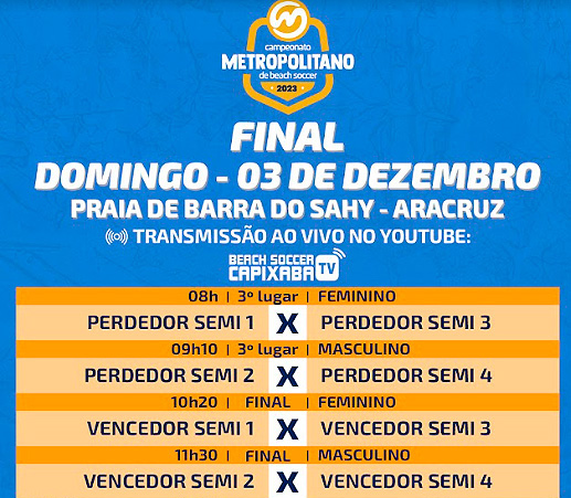 A principal competição de clubes de Beach Soccer do Espírito Santo está chegando ao apito final em 2023! A Série A do Campeonato Metropolitano, que conta com craques como Bruno Xavier, melhor do mundo em 2013, Anderson Dias, Campeão da Copa do Mundo e da Libertadores, tem suas semifinais e finais neste sábado (02) e domingo (03), respectivamente.