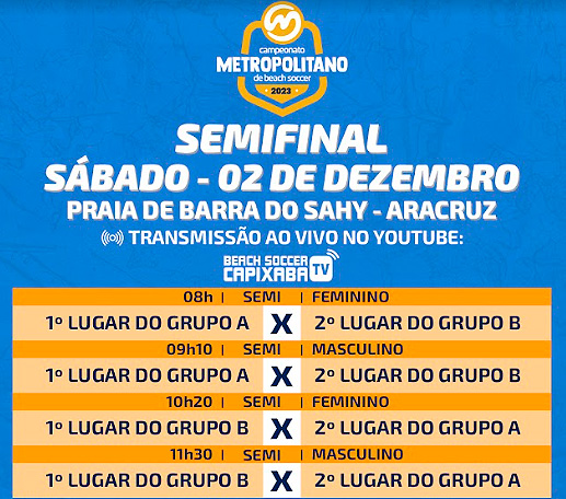 As semifinais ocorrem no sábado (02). O jogo entre Anchieta e Esquina começa às 9h10, enquanto SEG e PSNE se enfrentam às 11h30. Os vencedores fazem a grande final no domingo (03), às 11h30, e os perdedores definem o terceiro lugar às 9h10, neste mesmo dia.