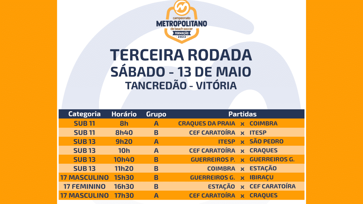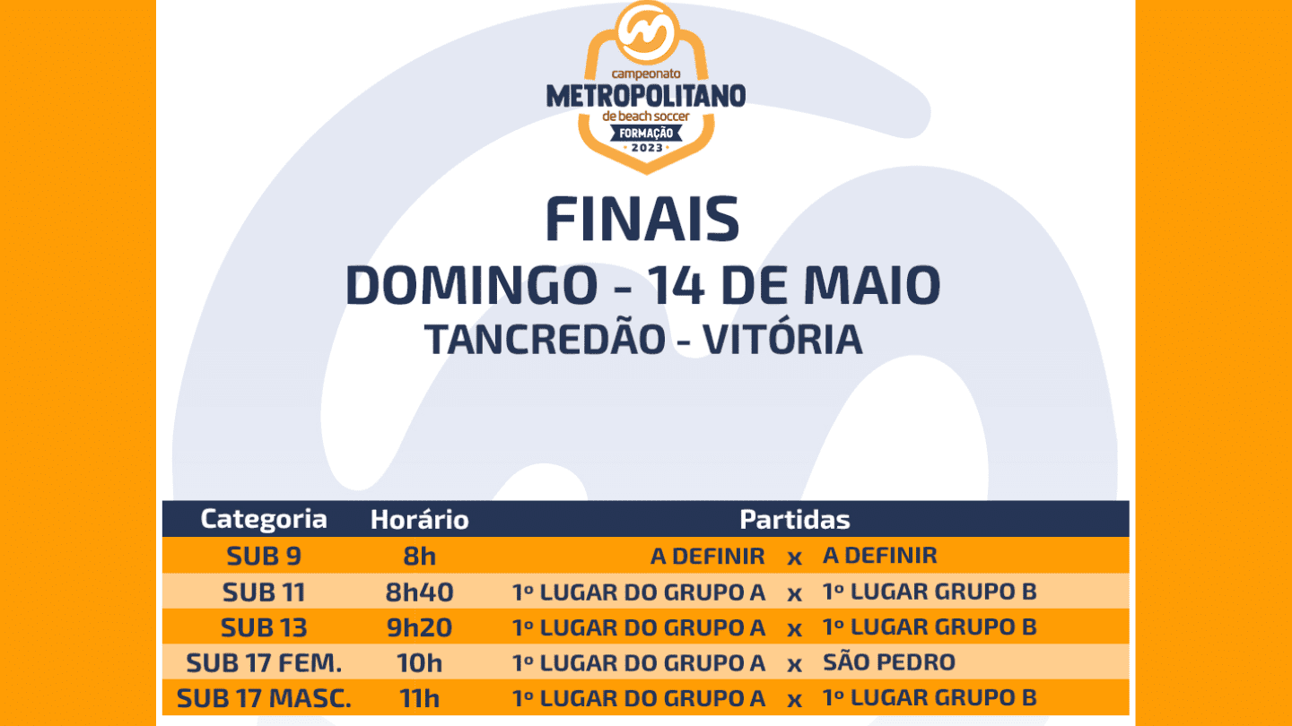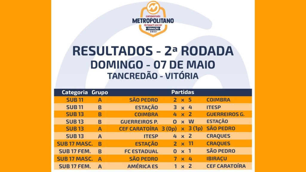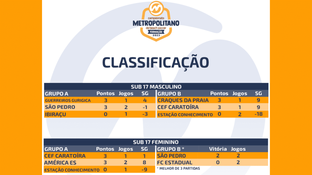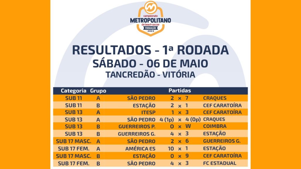 O Campeonato Metropolitano de Base de Beach Soccer teve 20 partidas neste fim de semana, no Tancredão, em Vitória. Os jogos só definiram um finalista, o São Pedro, no sub 17 feminino, os outros classificados serão definidos no próximo sábado (13).