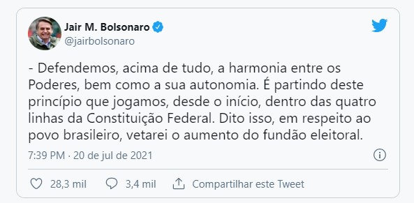 “Defendemos, acima de tudo, a harmonia entre os Poderes, bem como a sua autonomia. É partindo deste princípio que jogamos, desde o início, dentro das quatro linhas da Constituição Federal. Dito isso, em respeito ao povo brasileiro, vetarei o aumento do fundão eleitoral”, escreveu o presidente em postagem na sua conta de Twitter.
