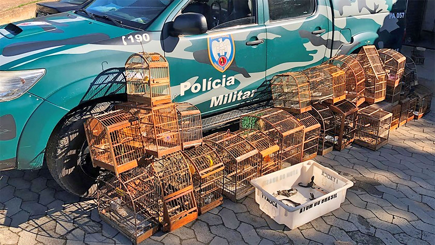 Na manhã desta segunda-feira (06) uma equipe da 1ª Companhia do Batalhão de Polícia Militar Ambiental (BPMA) constatou, durante patrulhamento na área de Guarapari, uma residência com muitas gaiolas onde foram encontradas 30 aves da fauna silvestre brasileira e nove filhotes de jacarés.