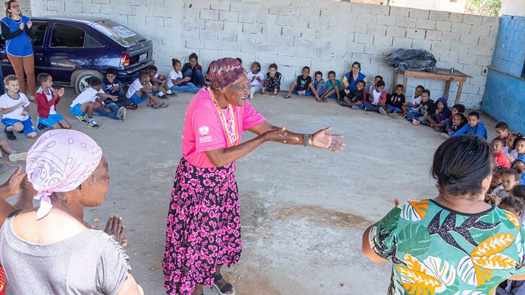 A roda de conversa termina ao som dos tambores e das palmas, quando as crianças se juntam às mestras para cantar e dançar.