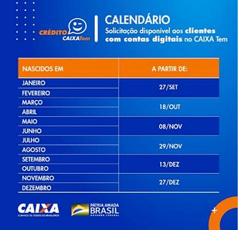 Nesta segunda-feira (27/09), estará disponível a contratação para os nascidos em janeiro e fevereiro, seguindo até 27 de dezembro, com os nascidos em novembro e dezembro. Confira o calendário completo: