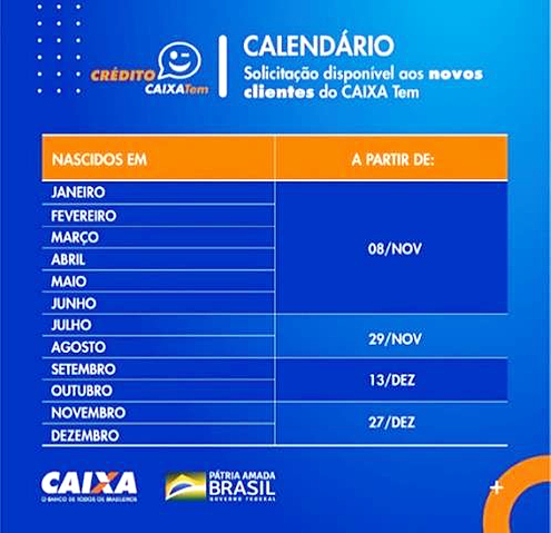 A partir de 8 de novembro, novos clientes podem abrir sua conta no CAIXA Tem e ter acesso aos serviços da conta Poupança Digital+. A possibilidade de solicitação de crédito também será disponibilizada para novos usuários, ou seja, todos os brasileiros poderão ter sua conta digital na CAIXA e solicitar o Crédito CAIXA Tem. A oferta dos empréstimos para novos clientes segue calendário que se inicia em 8 de novembro. Confira: