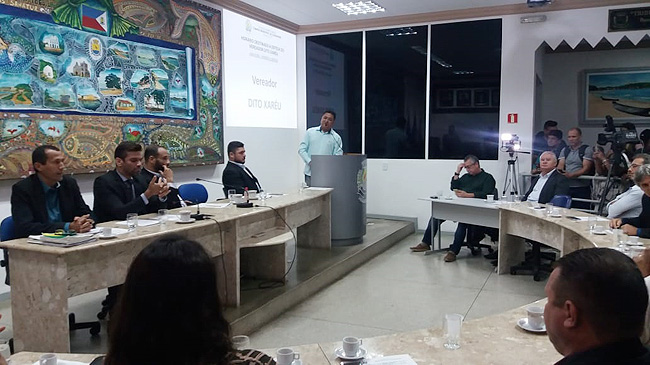 A sessão foi inciada com a apresentação dos áudios para que os vereadores e o público presente tivesse acesso ao conteúdo da denúncia. Em seguida, o vereador Dito Xaréu e seu advogado, Marcos Bitencourt, puderam apresentar a defesa durante uma hora.