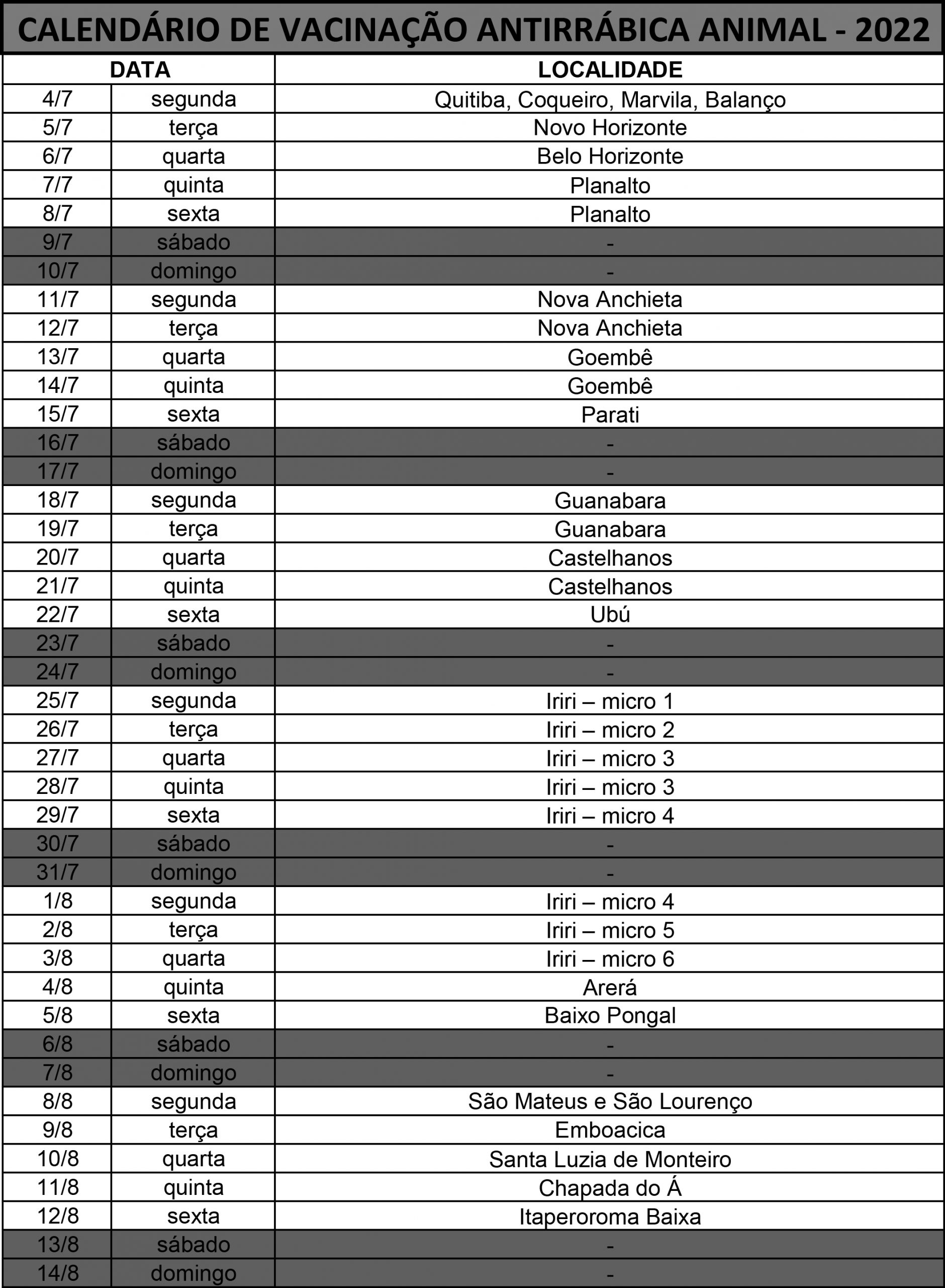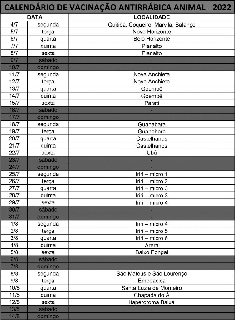 Anchieta irá iniciar na segunda-feira, dia 04 de julho, a Campanha de Vacinação Antirrábica 2022. A equipe da Vigilância Ambiental estará a partir desse dia percorrendo todas as comunidades para vacinar casa a casa cães e gatos, no horário das 8 às 15h, conforme um cronograma abaixo.