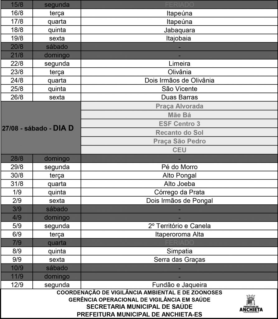 No sábado, 27 de agosto, acontece o Dia D, quando a vacinação irá acontecer em pontos fixos da sede e nas comunidades de Recanto do Sol e Mãe-Bá. Nesse dia os animais precisarão ser levados pelos tutores até um dos postos para serem vacinados.