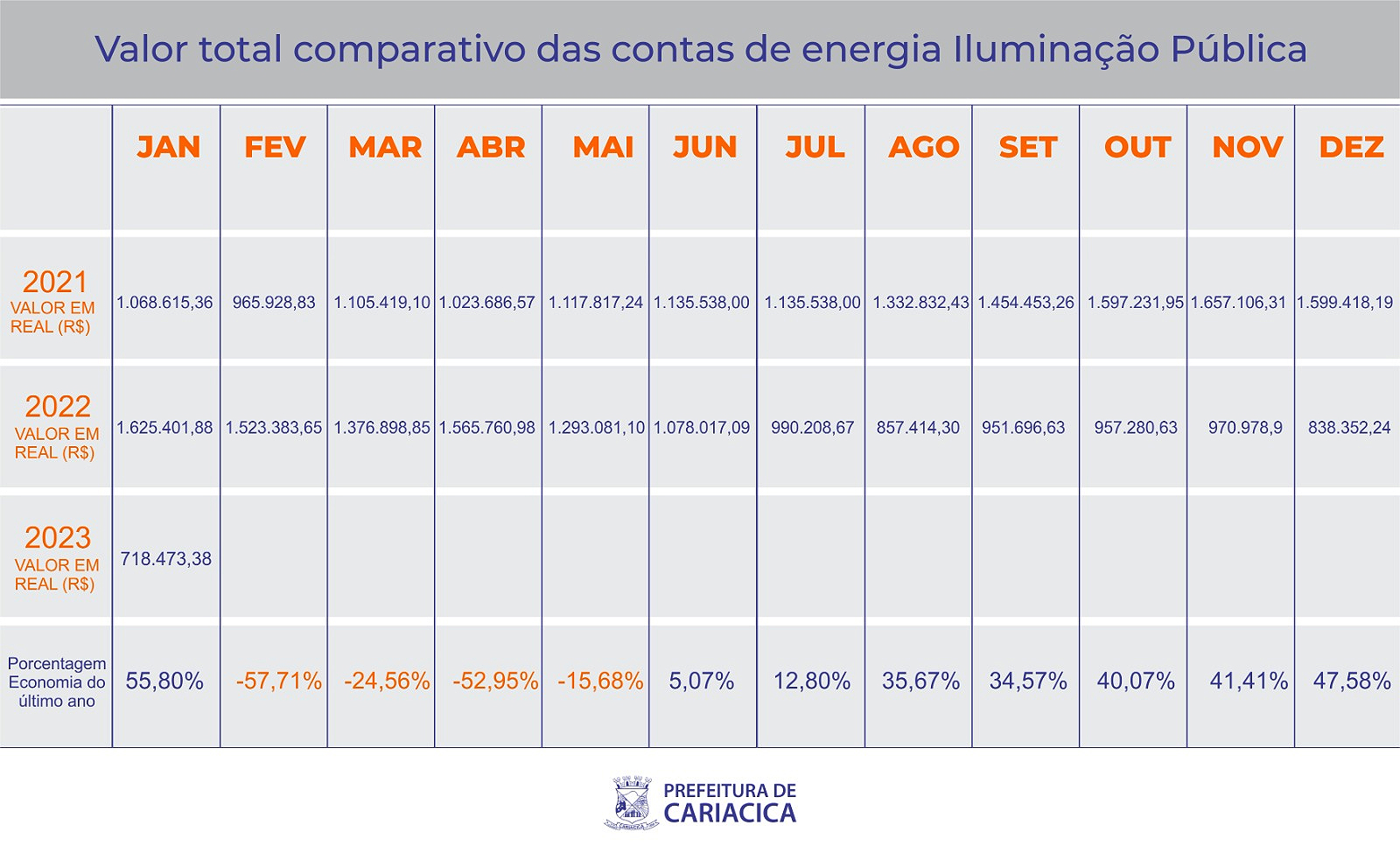 “O resultado desse trabalho se reflete na economia aos cofres públicos. Em dezembro de 2021, o consumo foi o maior, com conta de energia da iluminação pública no valor de R$ 1.599.418,19. Depois da implantação do sistema e com a troca das luminárias, essa despesa caiu para R$ 838.352,24, no mesmo mês de 2022. De um ano para o outro, o percentual de economia foi de 47,58%”, detalhou Marcos Aranda, secretário de Serviços.
