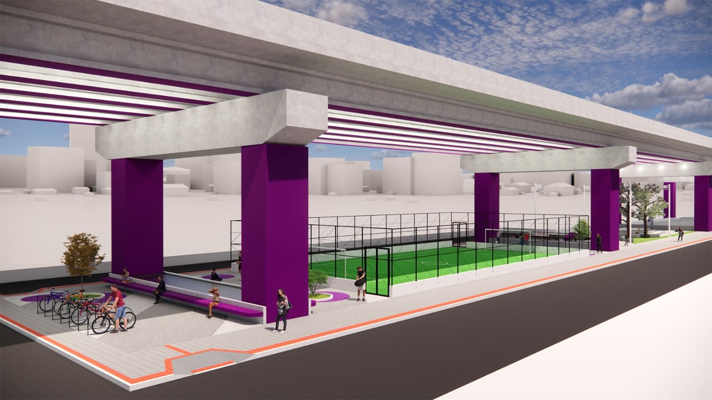 Sobre a galeria será construído um parque linear com a mesma extensão. O parque será dotado de pista de skate, quadra poliesportiva com fechamento em alambrado, campo de futebol society, quadra de tênis, dois parquinhos infantis, pracão (área para cães). E ainda: estacionamentos para 32 carros e 23 motos; vagas em bicicletários distribuídas ao longo do parque; espaço para barraquinhas de alimentação e artesanato; espaço para realização de eventos; e áreas de estar, com bancos e lixeiras.