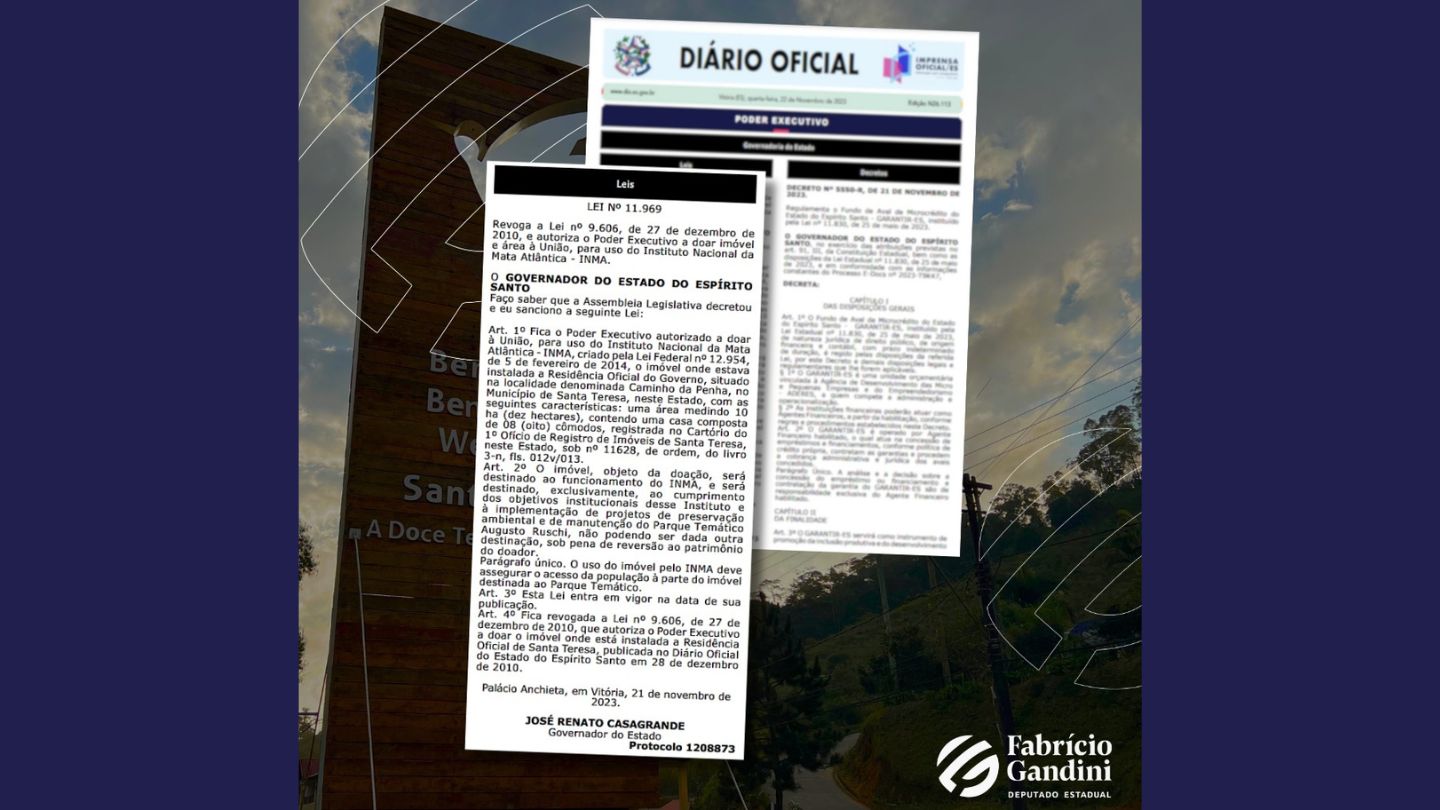 Uma boa notícia para a população de Santa Teresa e para os turistas que visitam o município. É que o governador Renato Casagrande (PSB) sancionou a Lei nº 11.969, de autoria do presidente da Comissão de Proteção ao Meio Ambiente da Assembleia Legislativa, deputado estadual Fabrício Gandini (PSD), que autoriza o Poder Executivo a doar uma área de 100 mil metros quadrados, no início da cidade, ao Instituto Nacional da Mata Atlântica (Inma), mesma instituição que administra o Museu de Biologia Professor Mello Leitão.