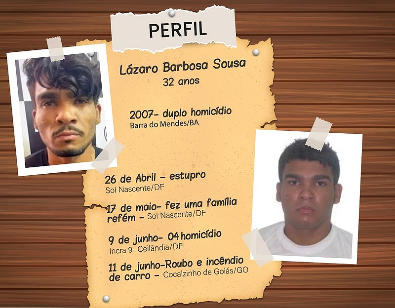 Lázaro Barbosa, 32 anos, é natural do estado da Bahia, onde também já cometeu crimes de homicídio. Segundo a Polícia Civil do local, ele assassinou duas pessoas no município de Barra do Mendes, em 2007, e chegou a ser preso após se entregar na delegacia. Porém, dias depois de confessar a autoria das mortes e ser encarcerado, ele fugiu da penitenciária.
