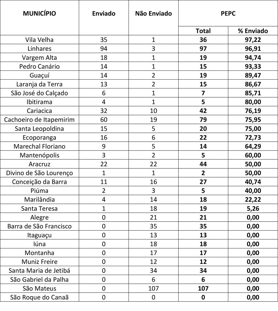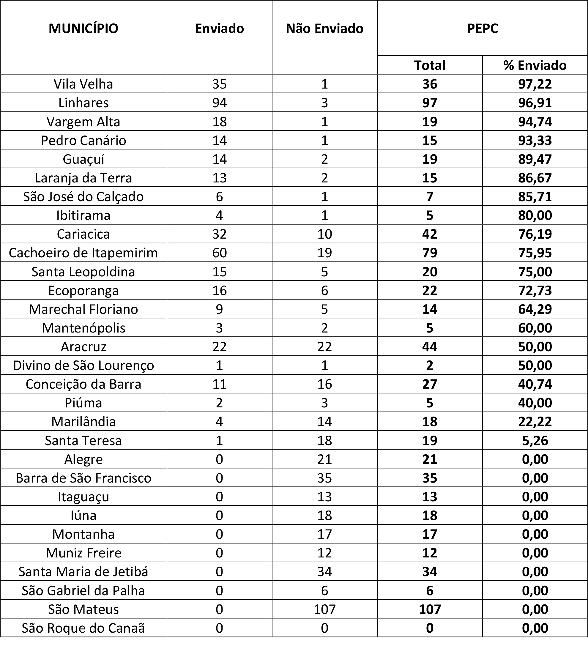 Após receberem um ofício para encaminhar a listagem com a relação das escolas com retorno presencial, 58 municípios responderam, em 15 de março. Desses, somente em 28 municípios a totalidade das escolas com retorno presencial havia enviado o PEPC para a plataforma Escola Segura do Governo. Ao todo foram identificadas 380 escolas, dos outros 30 municípios, que não possuem PEPC cadastrado na Plataforma Escola Segura do Governo do Estado, em cumprimento à previsão da portaria.