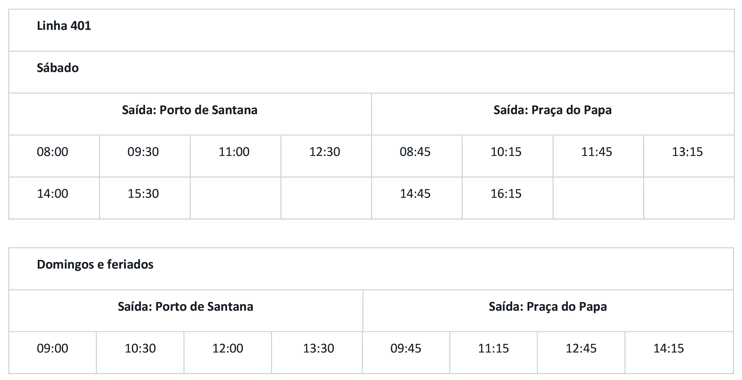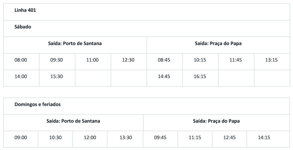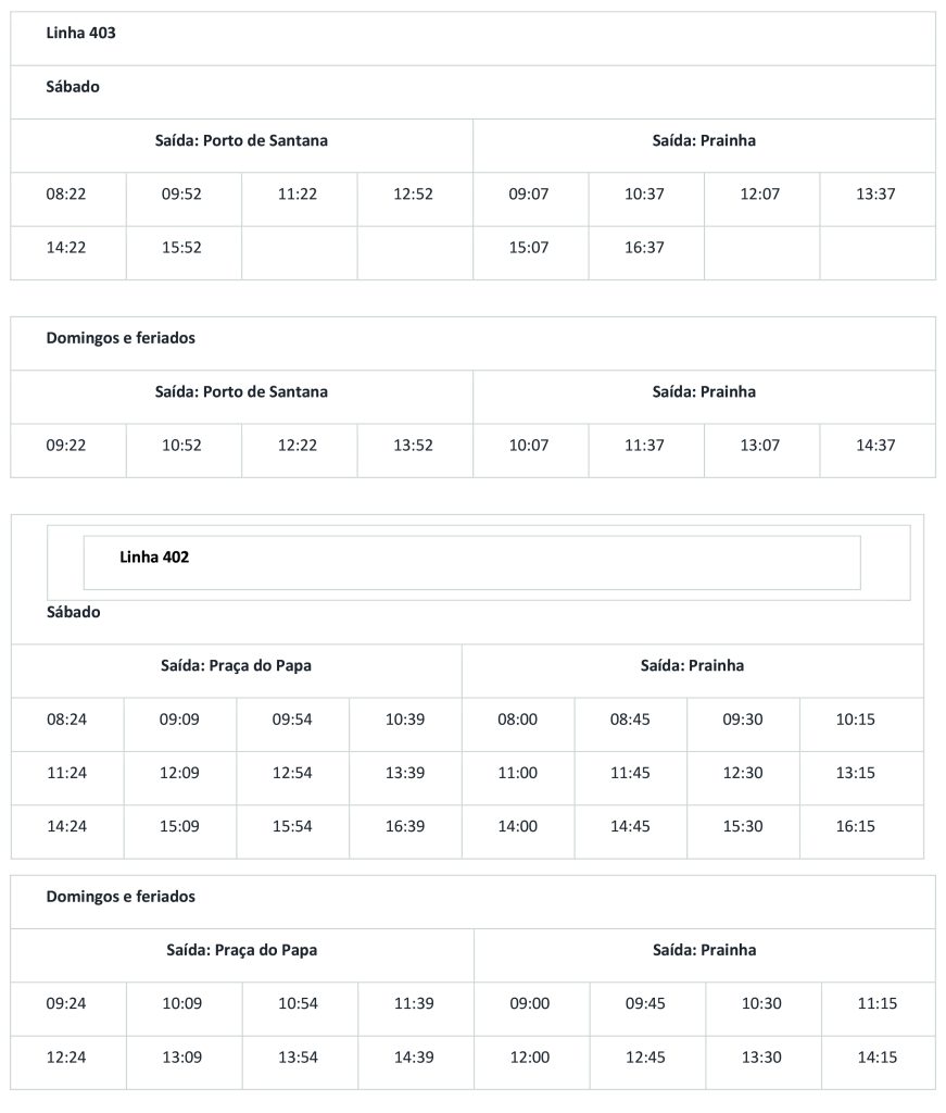 A primeira partida da linha 403 acontecerá às 8h20 de sábado, saindo de Porto de Santana. O tempo médio das viagens é de cerca de 40 minutos. Serão 12 viagens entre as estações aos sábados e oito aos domingos e feriados.