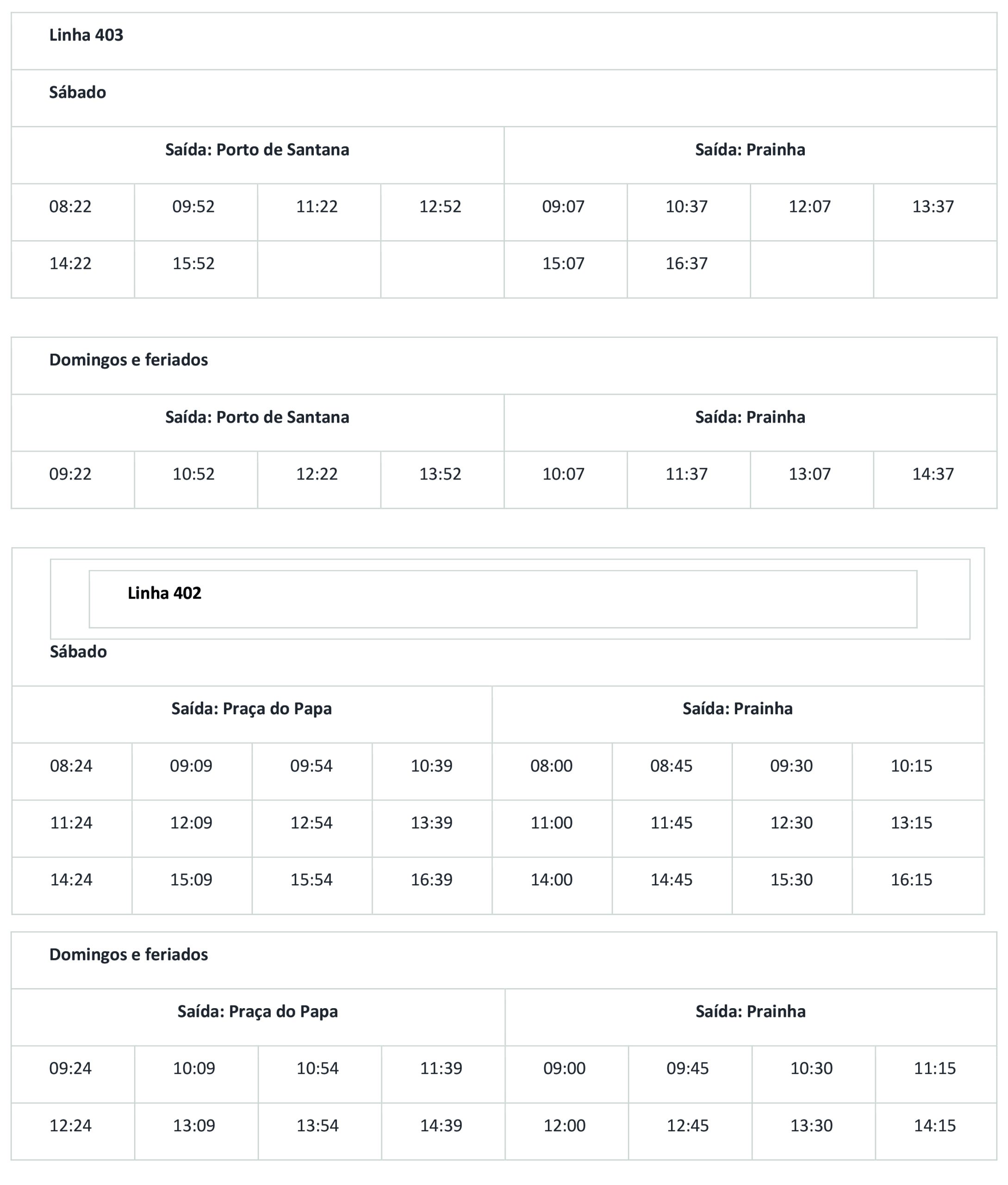 Com a circulação da linha 403, as duas outras linhas em operação sofrerão mudanças em seu quadro de horários nos fins de semana e feriados. Abaixo você confere a tabela com os novos horários.