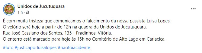 A ciclista que morreu atropelada por um Chevrolet Onix branco na noite da última sexta-feira, 15, foi identificada como passista da escola de samba Unidos de Jucutuquara, modelo e cursava o último ano de oceanografia na Universidade Federal do Espírito Santo (UFES): Luísa Lopes, de 24 anos.