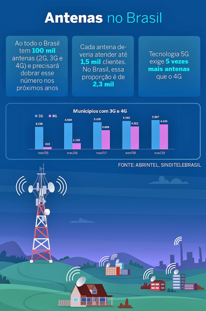As antenas que fornecem o sinal 5G, segundo o presidente Associação Brasileira de Infraestrutura para Telecomunicações (Abrintel), Luciano Stutz, precisam ser em maior número em relação às de 4G pelo fato da tecnologia 5G demandar uma maior quantidade de transmissão de dados entre o fornecedor de internet e a pessoa que está conectada.