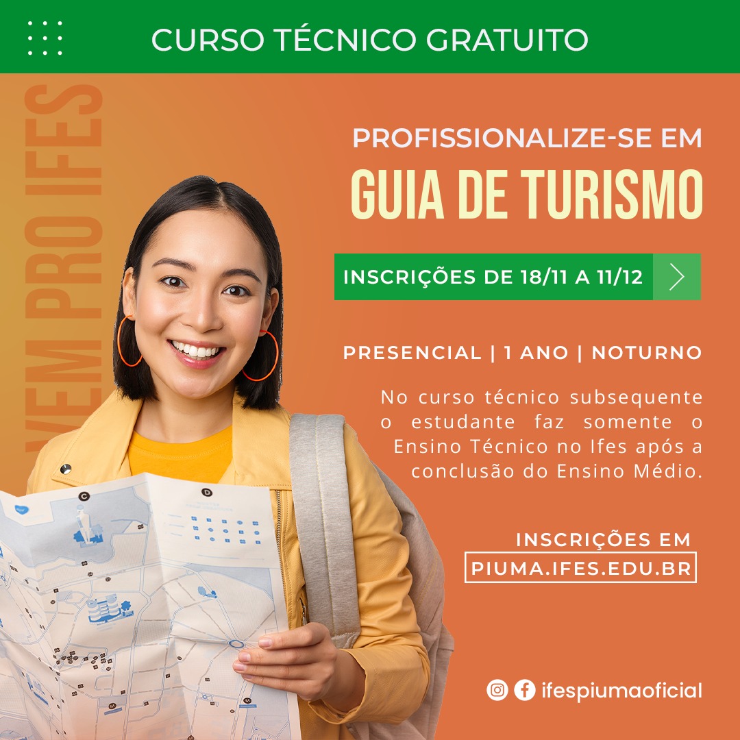 O Ifes – Campus Piúma torna público o Edital nº 142/2022, que oferta vagas do Curso Técnico em Guia de Turismo subsequente ao ensino médio, modalidade presencial, período noturno, para ingresso no primeiro semestre de 2023. O curso é voltado para aqueles que já concluíram o Ensino Médio ou irão concluir em 2022.