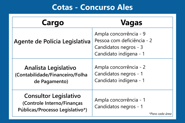 O concurso público da Assembleia Legislativa do Espírito Santo (Ales) prevê reserva de vagas para candidatos que se enquadram no sistema de cotas nos cargos de Agente de Polícia Legislativa, de Analista Legislativo e de Consultor Legislativo. Seguindo as legislações referentes às cotas em concursos públicos, há vagas destinada a pessoas com deficiência, negros e indígenas.