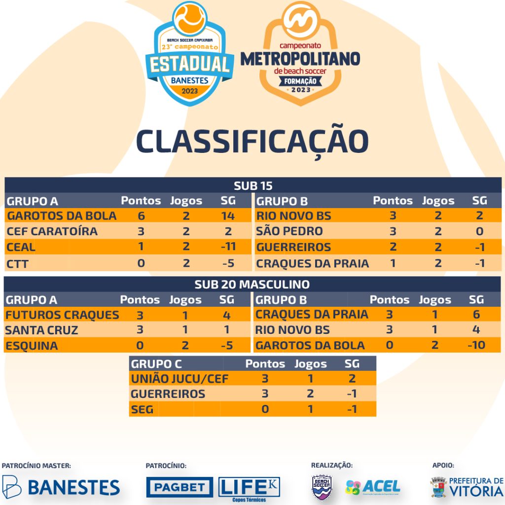 O mesmo equilíbrio do grupo B do sub 15 também apareceu em todos os jogos do sub 20 e na classificação das três chaves. Pelo grupo A, Futuros Craques, de Marataízes, e Santa Cruz, de Vitória, venceram seus jogos contra o Esquina e agora disputam entre si a vaga do grupo para a semifinal. A equipe do Sul do Estado venceu por 7 a 3 e a de Vitória ganhou por 3 a 2.