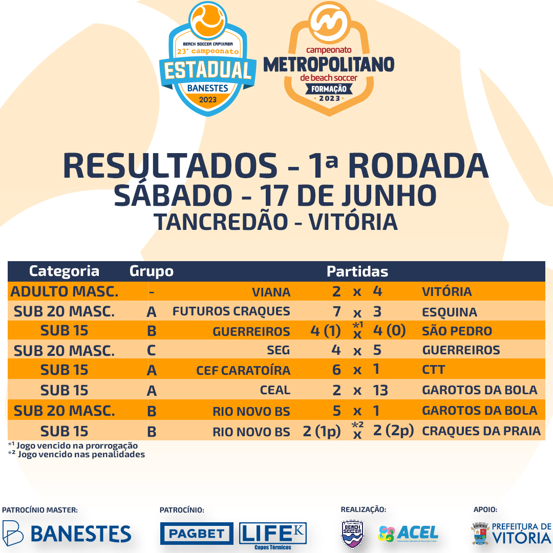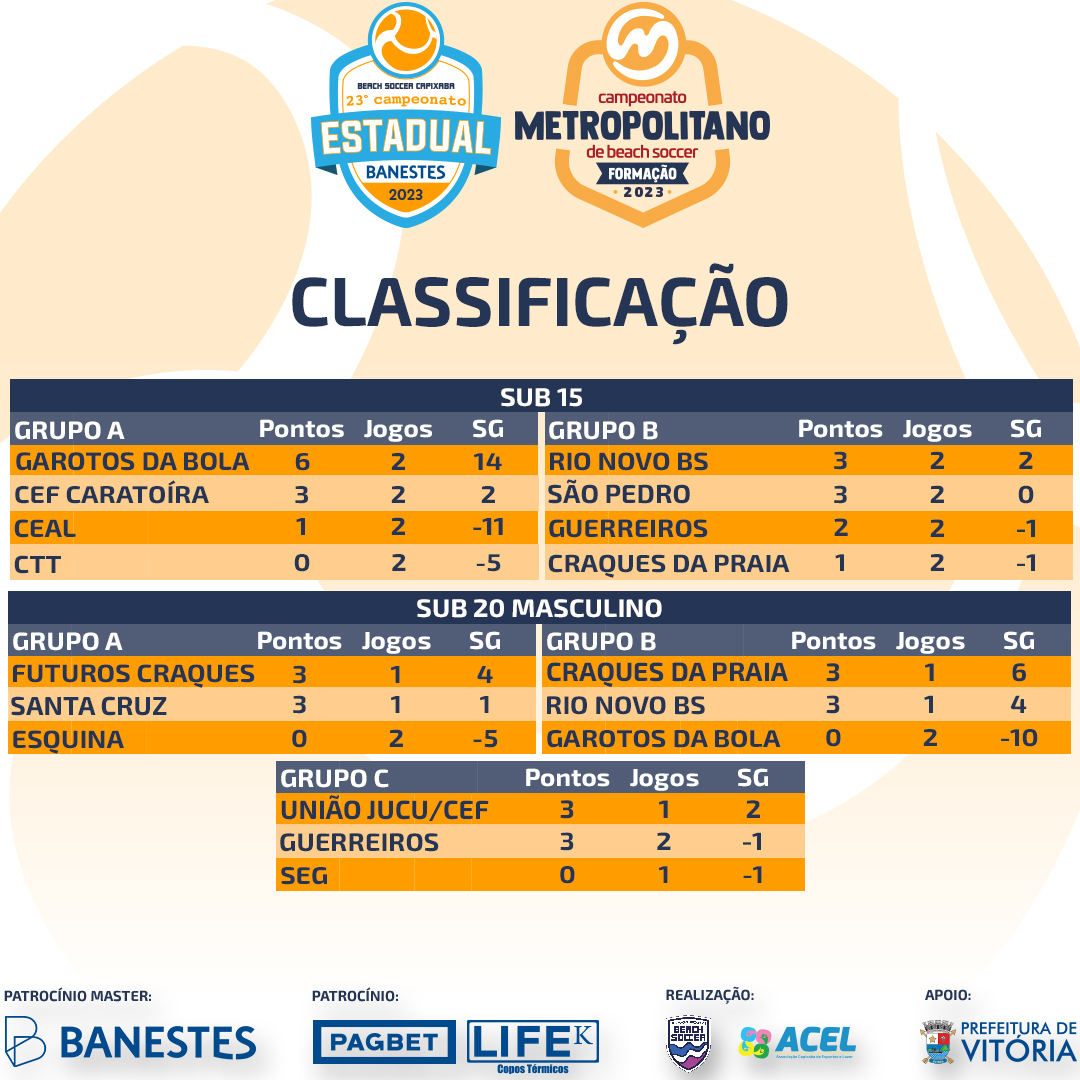 Pela chave B, o mesmo panorama. Craques da Praia e Rio Novo BS decidem no próximo sábado (24) quem irá para a semifinal, já que os dois venceram o Garotos da Bola, por 9 a 3 e por 5 a 1, respectivamente.