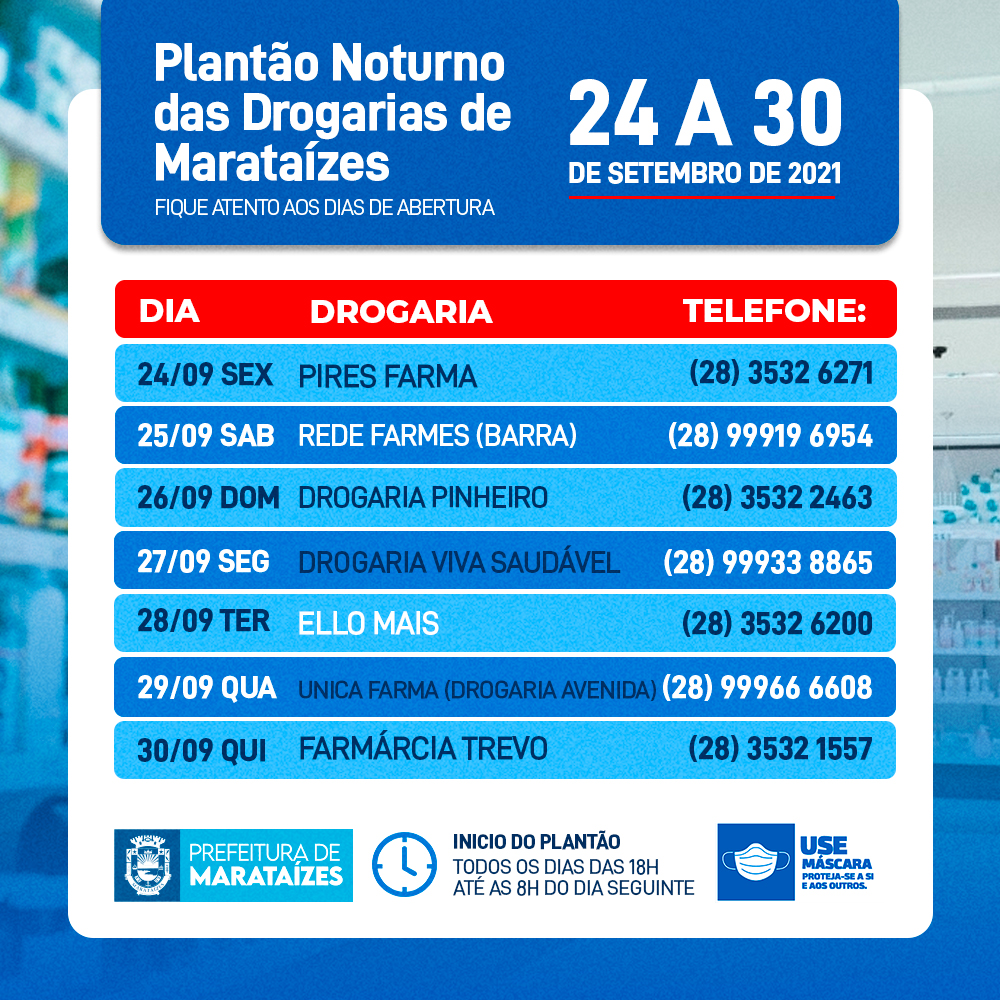 Confira as farmácias que vão estar de plantão em Marataízes de 24 a 30 de setembro