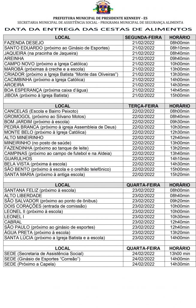 A Prefeitura de Presidente Kennedy informa que a rota da entrega de cestas básicas sofreu alteração neste mês de fevereiro.