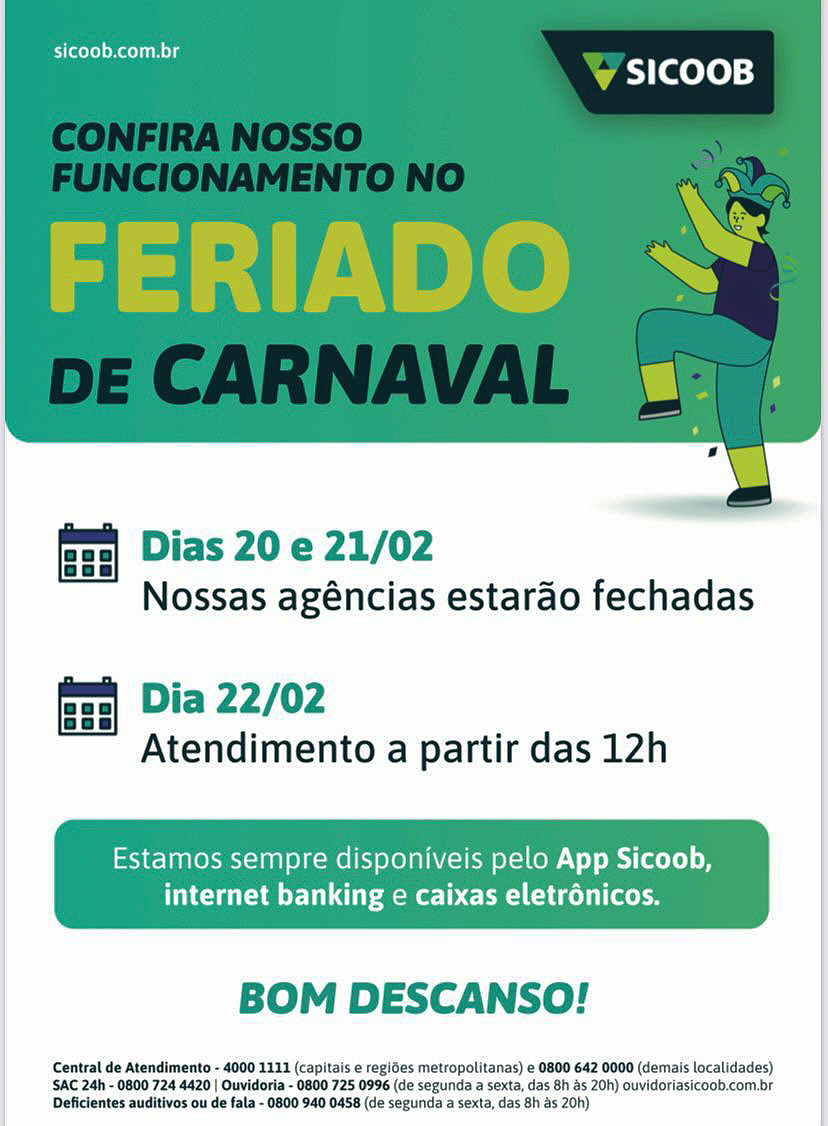 Nesta sexta-feira, dia 17 de fevereiro, a cooperativa de crédito funciona normalmente, das 9 às 15h. Já nos dias 20 e 21 de fevereiro as agências estarão fechadas, retornando as atividades dia 22, quarta-feira de Cinzas, a partir das 12h e seguindo com o horário normal até às 15h.
