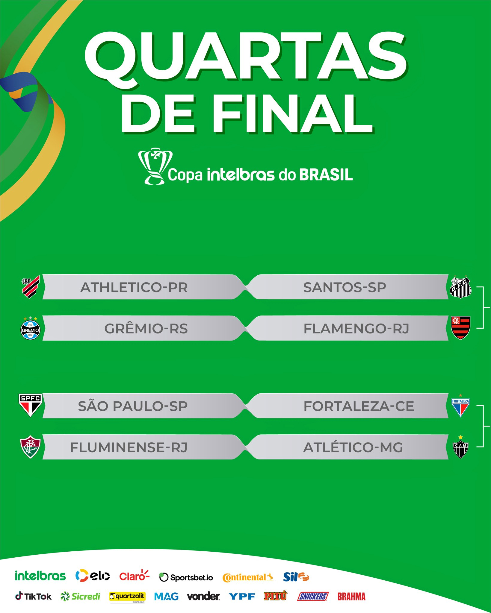 Em sorteio realizado na tarde desta sexta-feira (6), a Confederação Brasileira de Futebol (CBF) definiu os confrontos das quartas de final da Copa do Brasil: Santos x Athletico-PR, Grêmio x Flamengo, São Paulo x Fortaleza e Atlético-MG x Fluminense.