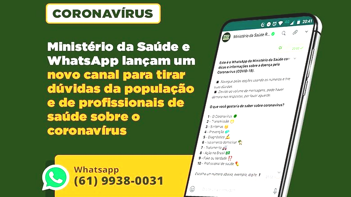 É importante reforçar que para utilizar o serviço “Ministério da Saúde Responde!”, é necessário incluir o número (61) 9938-0031 entre os contatos do Whatsapp. A conta funciona trazendo orientações a partir de temas específicos. Lembrando que é um serviço que utiliza um robô, desta forma, não é possível tirar dúvidas diretamente com um atendente.