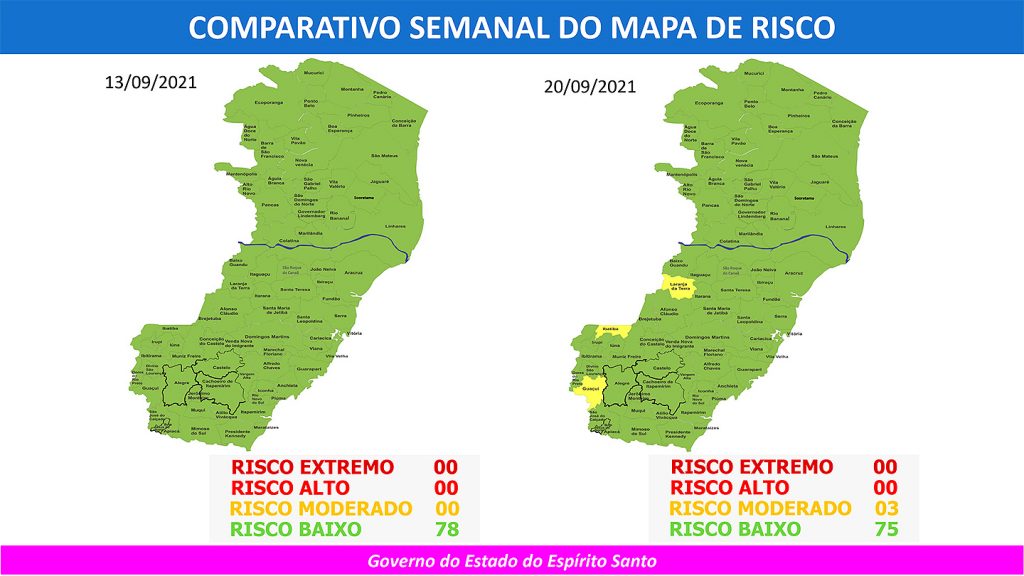 O Governo do Estado anunciou, nesta sexta-feira (17), o 73º Mapa de Risco Covid-19, que terá vigência desta segunda-feira (20) até o próximo domingo (26). Dos 78 municípios capixabas, 75 estão classificados em Risco Baixo e somente três (Guaçuí, Ibatiba e Laranja da Terra) em Risco Moderado.