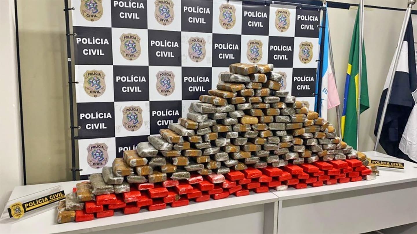 Com o flagrante, o policial pulou o muro e conseguiu deter um dos suspeitos. O outro indivíduo tentou correr, mas foi preso por policiais que estavam em frente à residência. Ao realizarem buscas, foram encontrados 190 tabletes de maconha, totalizando 150 quilos.