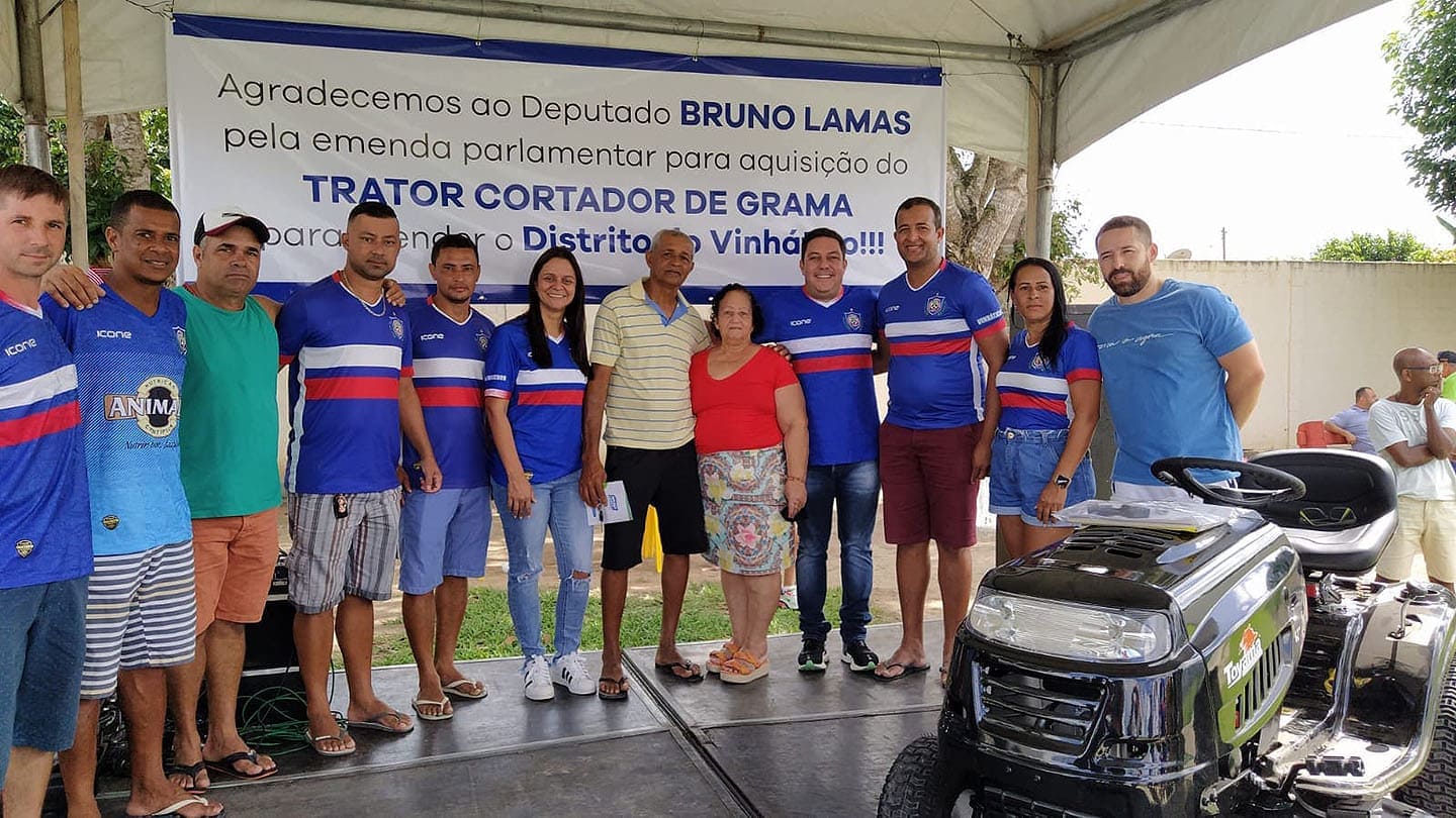 O deputado estadual Bruno Lamas (PSB) participou, no último sábado (2), em Montanha, de solenidades que marcaram a entrega de dois tratores cortadores de grama ao município, avaliados em R$ 18 mil cada, que são resultados de emendas parlamentares do seu mandato. Um foi destinado à Associação Futebol Clube de Vinhático e o outro à Secretaria de Cultura, Desporto e Turismo de Montanha.