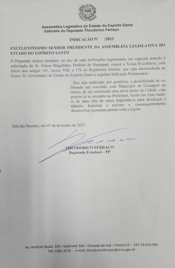 Foi aprovado por unanimidade na Assembleia Legislativa do Estado do Espírito Santo, na terça-feira, dia 07, um requerimento do deputado estadual Theodorico Ferraço solicitando, ao governo do Estado, a construção da terceira ponte de Guarapari. Um pedido do prefeito da cidade, Edson Magalhães.