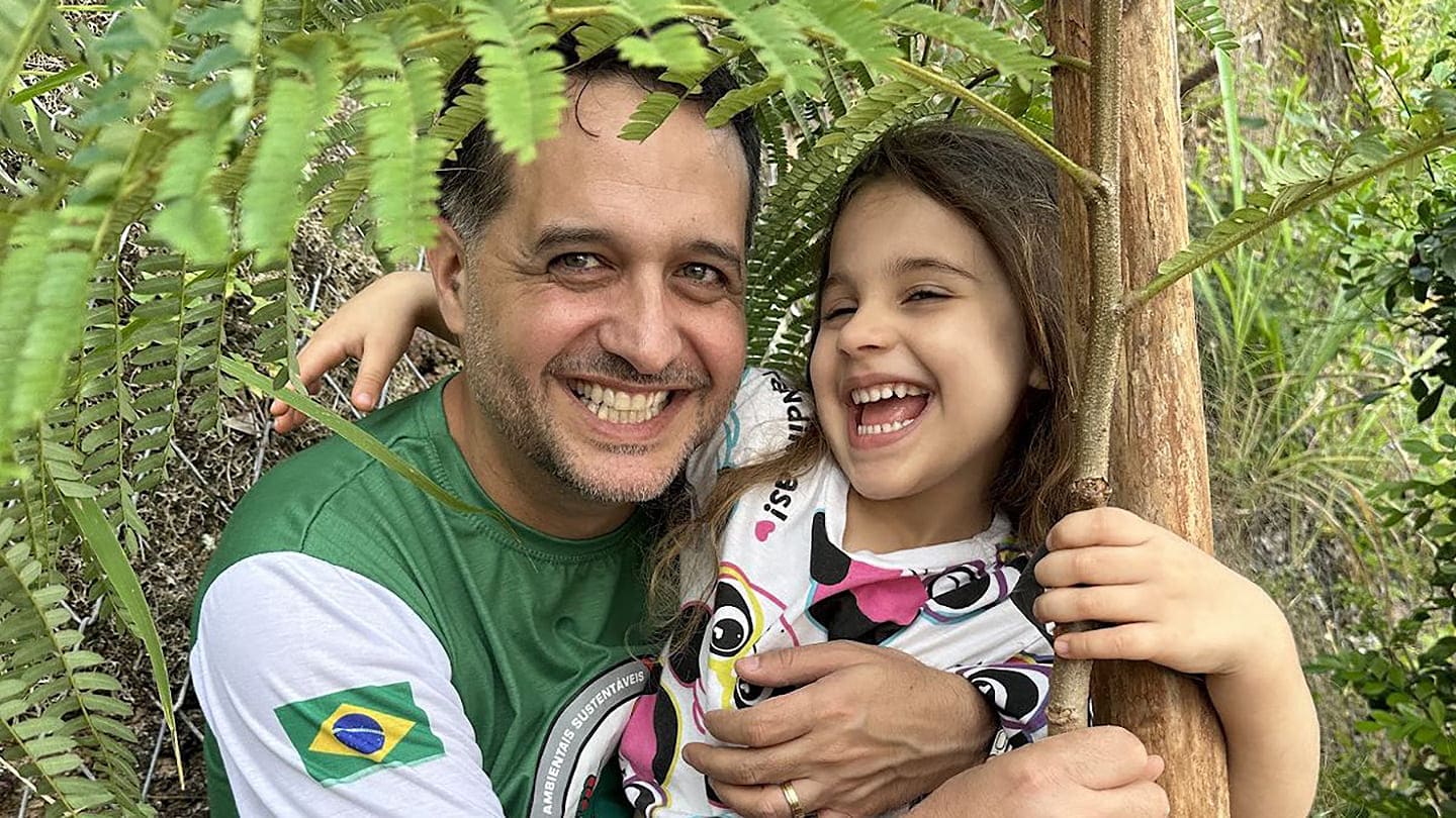 Gandini com a filha Mariana, ao lado de árvore plantada por eles, no Dia Mundial do Meio Ambiente.