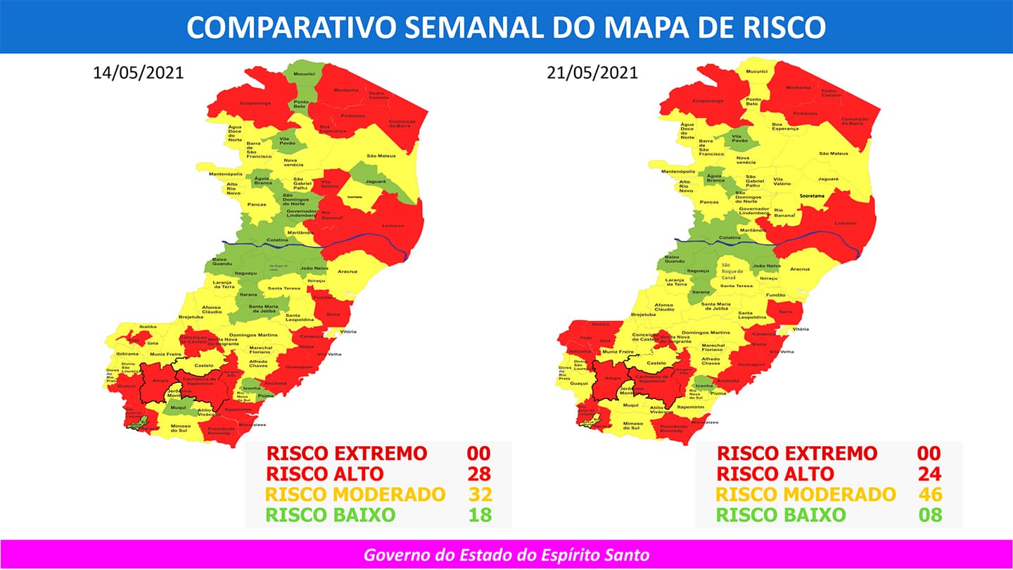 O Governo do Estado anunciou, nesta sexta-feira (21), o 56º Mapa de Risco Covid-19, que terá vigência desta segunda-feira (24) até o próximo domingo (30). Dos 78 municípios capixabas, oito estão classificados em Risco Baixo, 46 em Risco Moderado e outros 24 em Risco Alto.