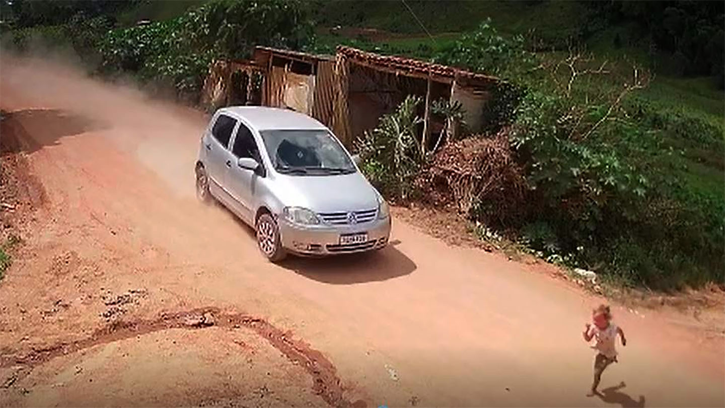 As imagens foram gravadas por uma câmera instalada na entrada de uma fazenda, onde mostra um VW Fox Prata em alta velocidade atropelando a menina ao atravessar a rua.