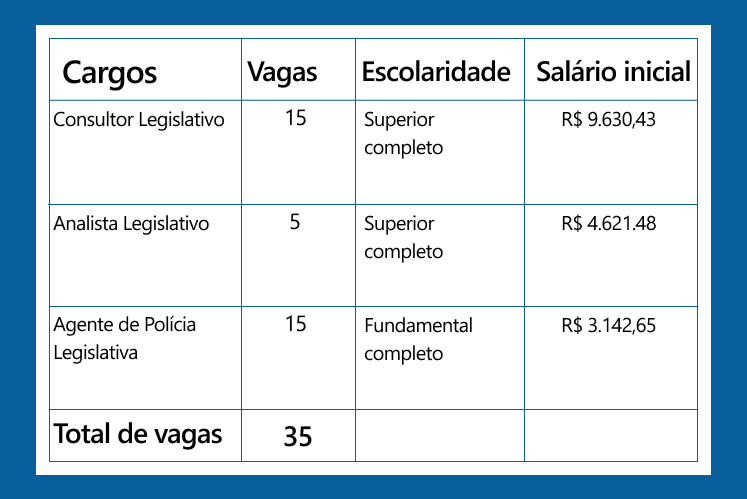 Estão previstas 35 vagas: 15 vagas para Consultor Legislativo, 5 vagas para Analista Legislativo e 15 vagas para Polícia Legislativa. “Dentro do nosso cronograma, a gente espera que o concurso seja aplicado e que a gente faça as nomeações em janeiro, fevereiro”, disse o diretor-geral.