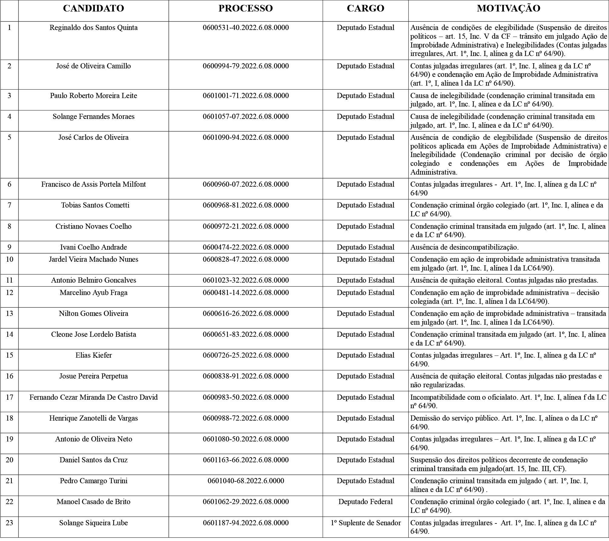 Alguns dos candidatos que tiveram o registro impugnado já regularizaram sua situação perante o TRE, ou houve pedido do próprio Ministério Público de improcedência da ação, e já estão aptos a participar do pleito de 2022. Outros, no entanto, continuam com a candidatura impugnada pelo MP Eleitoral.