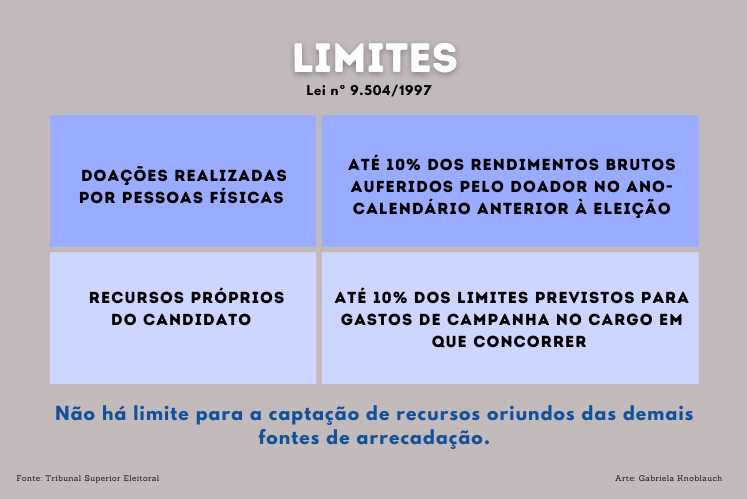 Algumas fontes de recursos para o pagamento das campanhas precisam respeitar os limites estabelecidos pela legislação que define as normas para as eleições (Lei Federal 9.504/1997).